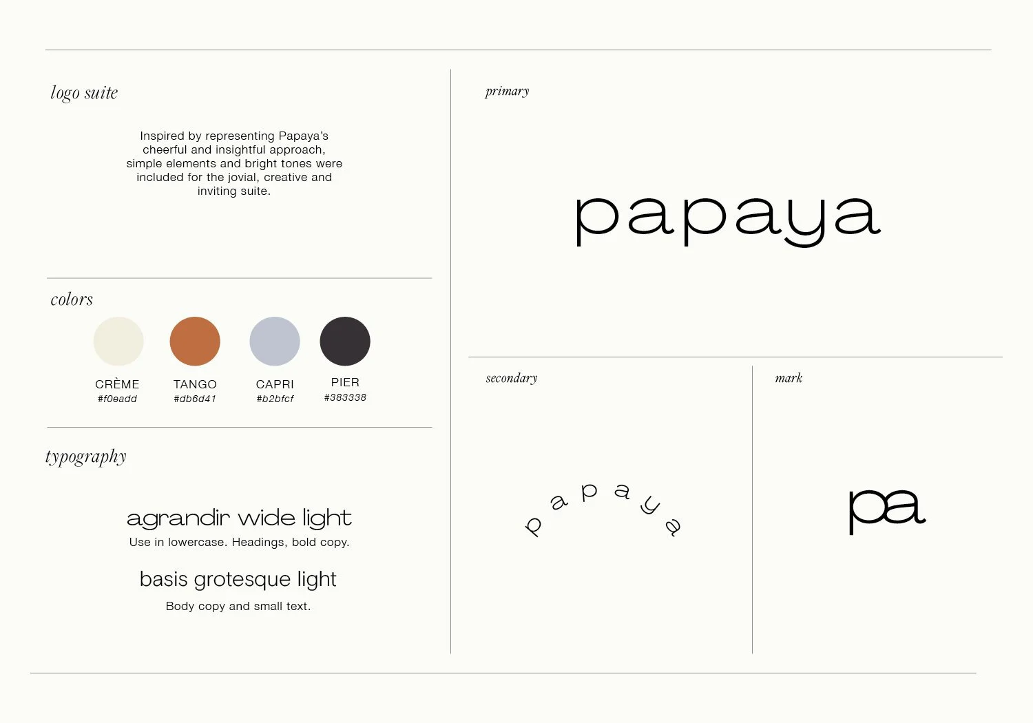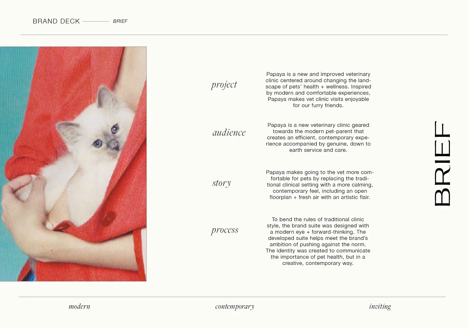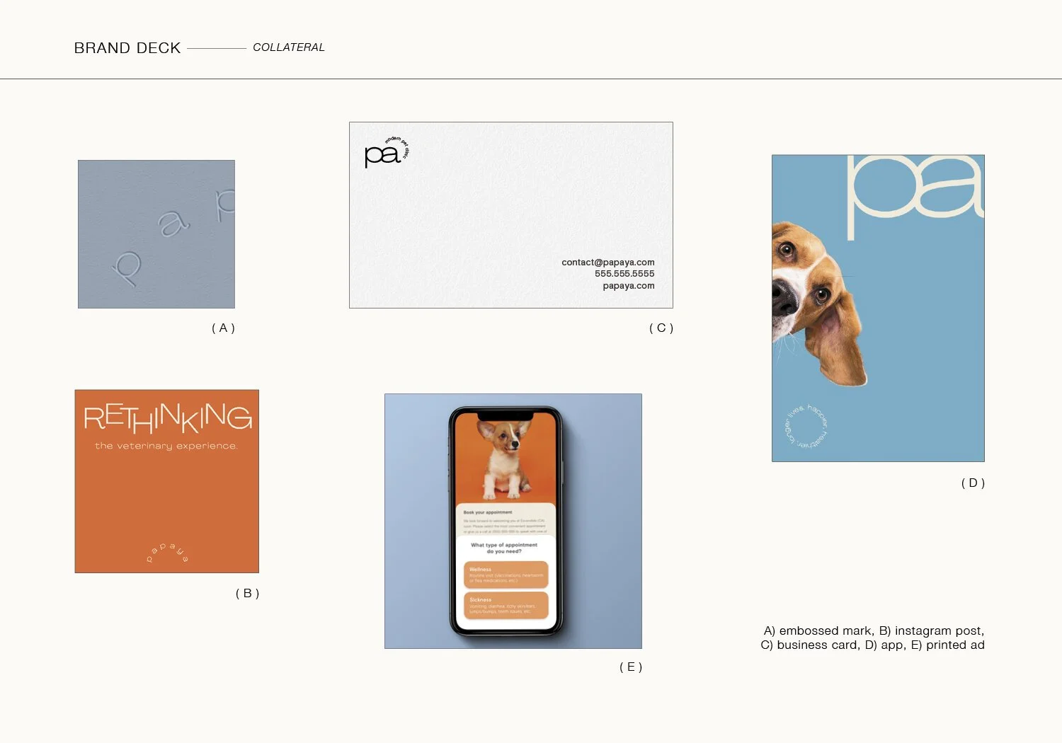 Papaya is a full-service veterinary clinic for dogs and cats that offers a fresh approach to health care for pets and the people that love them. As a test project during my first few weeks as an intern at the Los Angeles creative agency, Ludlow Kingsley, I created an internal branding suite with digital and print design assets.